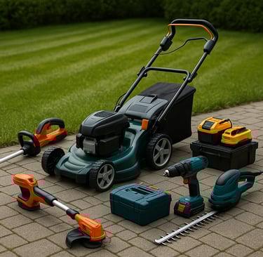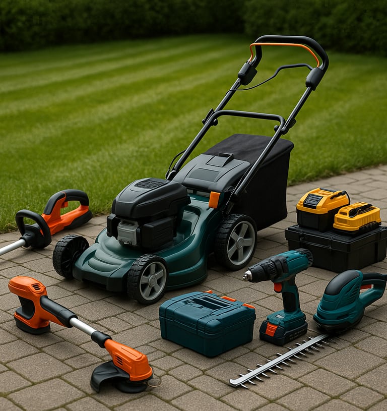 Produkte wie Rasenmäher, Werkzeuge oder Akkus für die Instandhaltung des Gartens.